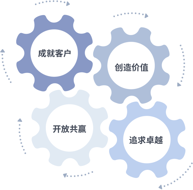 成就客户是一切决策的出发点,,,,创造价值是衡量所有工作的标准,,,追求卓越是我们做事做人的态度,,,开放共赢是我们的格局也是最终的结果。。价值观的齿轮环环相扣,,,推动着组织里的每个人不断向前。。。